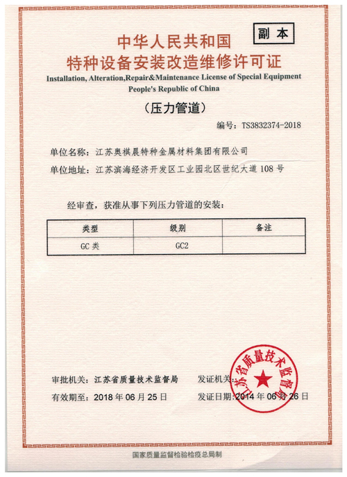 此為奧祺晨集團(tuán)繼獲得壓力容器證之后又一件大喜事,標(biāo)志著公司已經(jīng)具備了特種設(shè)備及壓力管道的安裝、改造、維修資格。