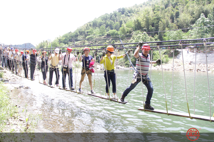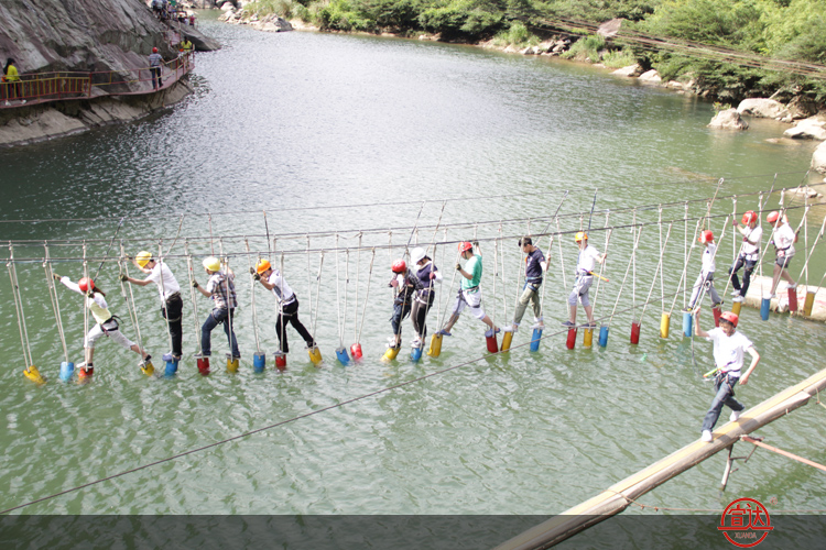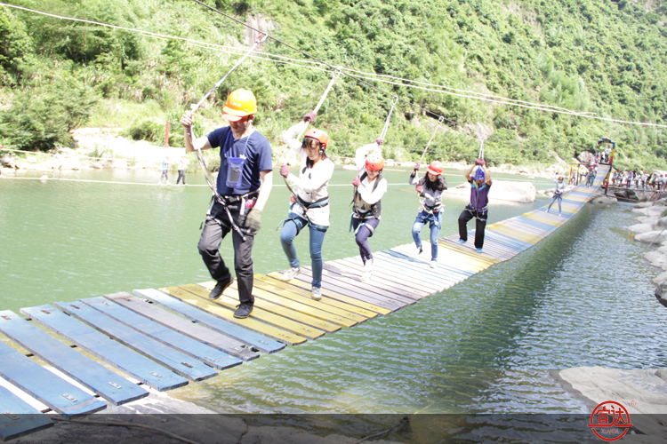 九鯉溪位于太姥山岳景區(qū)西南側,景區(qū)內(nèi)烏杯峽谷運動戶外樂園為目前國內(nèi)最大的景觀級戶外(拓展)培訓基地,素有“中國養(yǎng)生運動第一溪”之譽。景區(qū)設有緬甸橋、攜手并進、抽板過河、飛檐走壁、飛奪瀘定橋、滑索過澗、水上飛、高空溜索、浮樁橋、蕩繩過河、凌空漫步等十三項有趣而刺激的峽谷游玩項目。其中“緬甸橋”仿造緬甸熱帶叢林中的索橋,橋罩在網(wǎng)中,人過橋時如叢林歷險;“攜手并進”則是協(xié)作性的項目,兩人在舉步維艱中,必須互相幫助,默契配合,共榮共生;“抽板過河”板離水面不高,交接板時需腳踩準板,手抓準繩;“滑索過澗”在溪澗的另一側,需要挑戰(zhàn)者放下恐懼,勇敢地縱身一躍,耳旁是呼嘯的山風;“浮樁橋”須雙手緊握搖晃的繩索,腳下小心翼翼踩好每一個浮樁,可謂步步驚心……這些活動不但要求挑戰(zhàn)者具備一定的心理素質,而且考驗團隊的協(xié)作能力,沒有被困難所嚇倒的宣達勇士們硬是通過了一個又一個驚險的項目?;顒又幸渤錆M了團隊相處的和諧與歡樂,如“滑索過澗”中成功挑戰(zhàn)的同事需躲避先前已到達彼岸的同事“潑水之厄”,“蕩繩過河”中有些身手矯捷的男生明明成功過河了卻被對岸的同事推了回去,“凌空漫步”中一些男生故意調皮地將身子往左右傾斜企圖讓人失去平衡,現(xiàn)場不時傳起驚叫聲和陣陣歡笑聲……